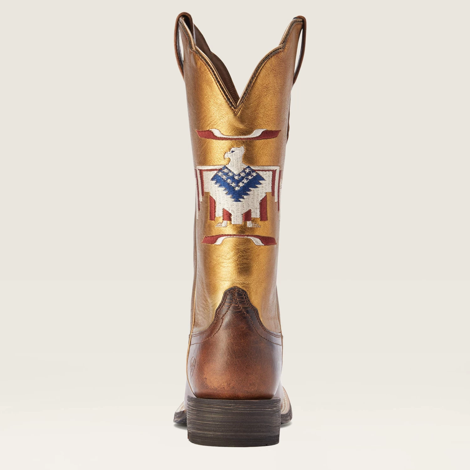 These shiny gold shafted boots with the patriotic thunderbird design are super cute. Being part of the Ariat Limited-Edition Chimayo Collection. These would be a great addition to any outfit.Â