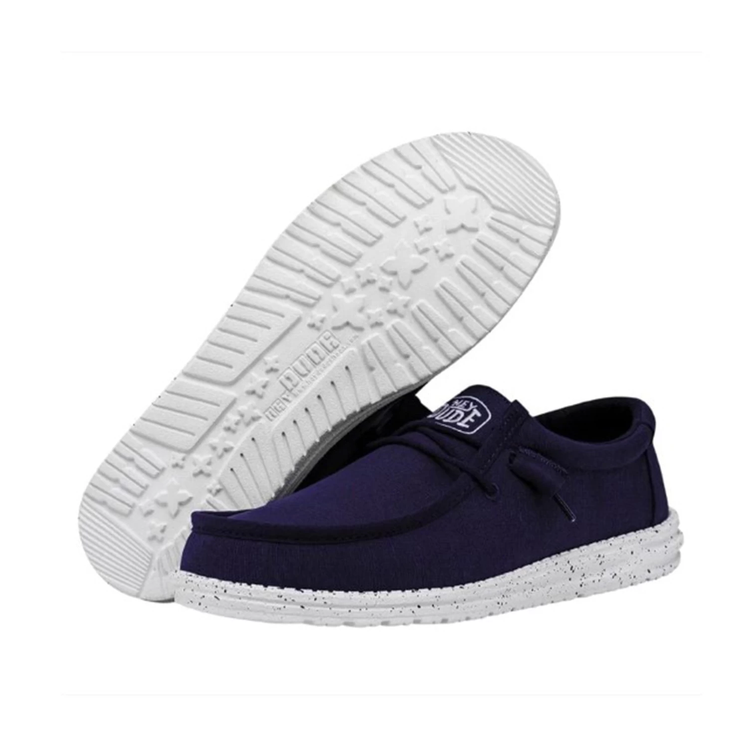 Happy feet, meet the Wally Slub Canvas collection. Hey Dude’s iconic, go-to moc combines a medium-weight, textile fabric with a vintage look and durability throughout. Finished off on an ultralight outsole featuring our easy-on system with no-tie, elastic laces and a cushioned ankle collar for all day support.