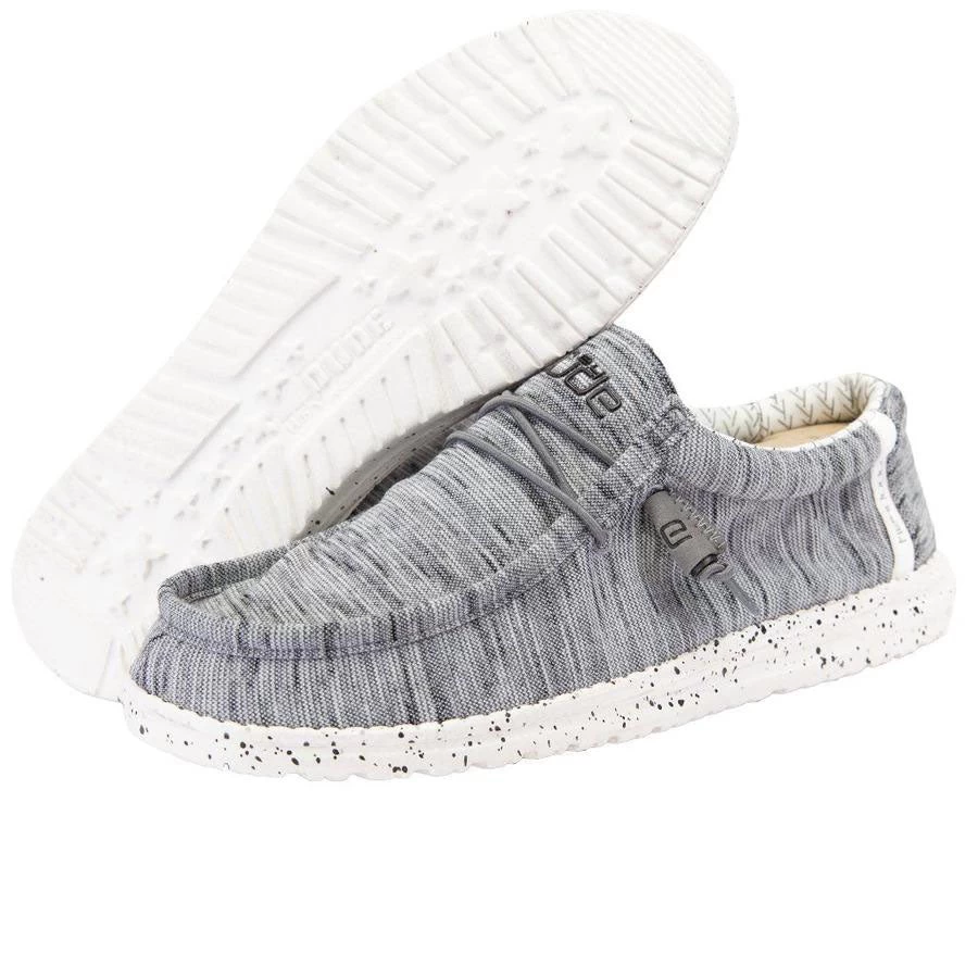These men’s shoes from Hey Dude are stone white with a white outsole! Hey Dude shoes are comfortable and very light weight! If you wear a half size, we suggest choosing the next up.Â