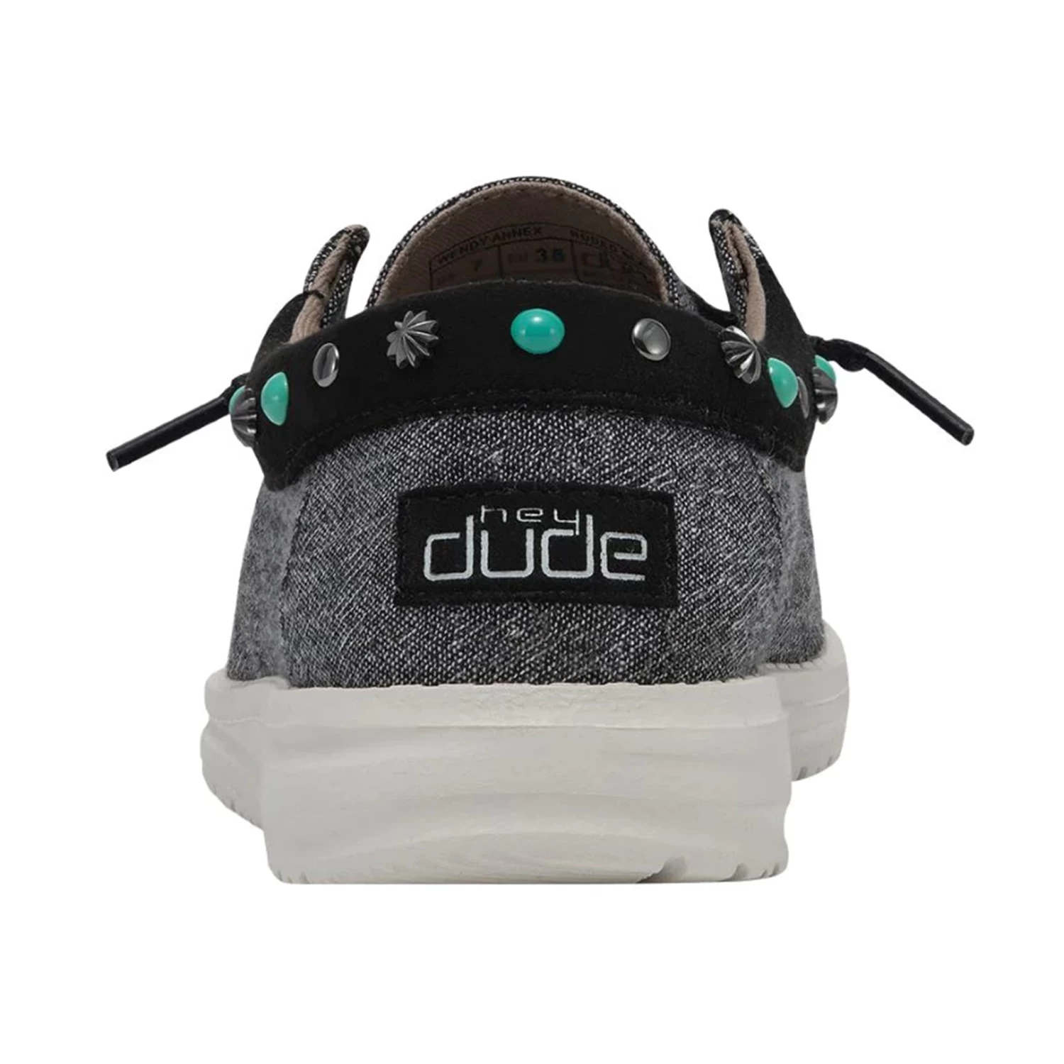 Hey Dudes Rodeo collection never disappoints and these new Wendy Annex Rodeo Black are no exception! A soft cotton canvas with hand-stitched and studded features throughout. Finished off with a suede collar, an ultralight outsole and elastic laces to keep the night goin’ from sunrise to sunset.