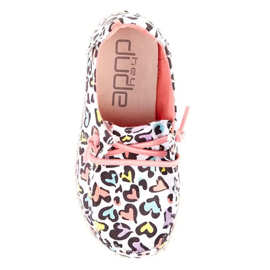 Hey Dude Wendy Toddler White Leopard. One of the most popular girls styles is now available in toddlers! Keep your little one in style, all while being comfy in these fun multi colored dudes!