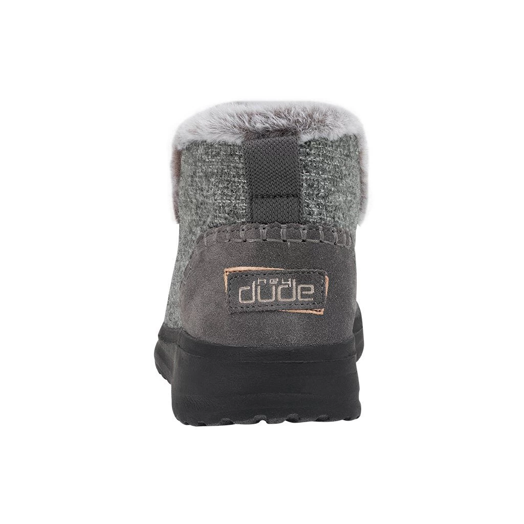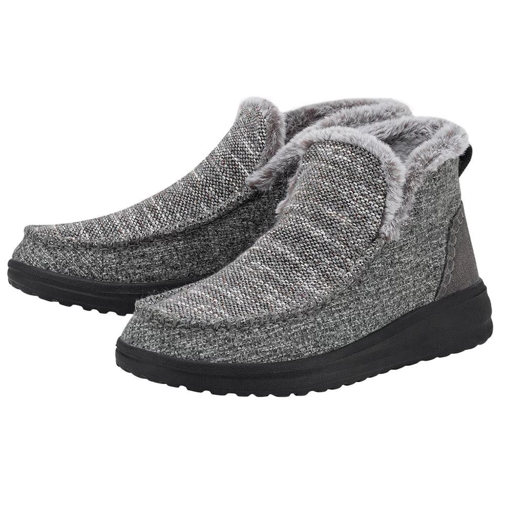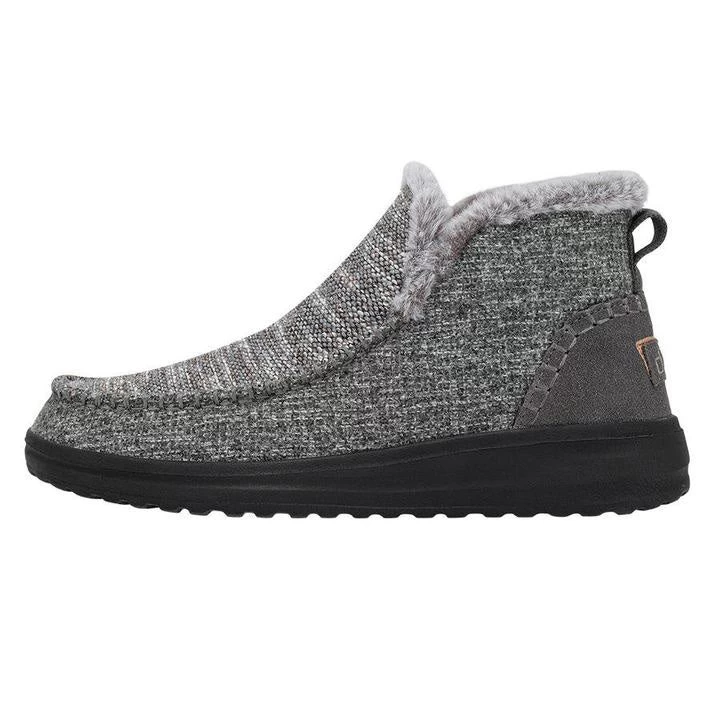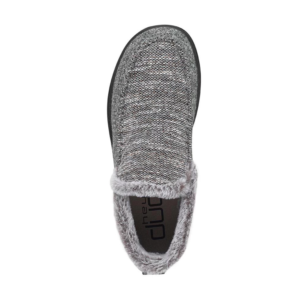Slip into these warm comfortable sleet grey moccasins for a day on the go. They are made of a soft wool blend with a faux fur lining and are very light weight. Keep your feet warm this winter with these adorable shoes.Â