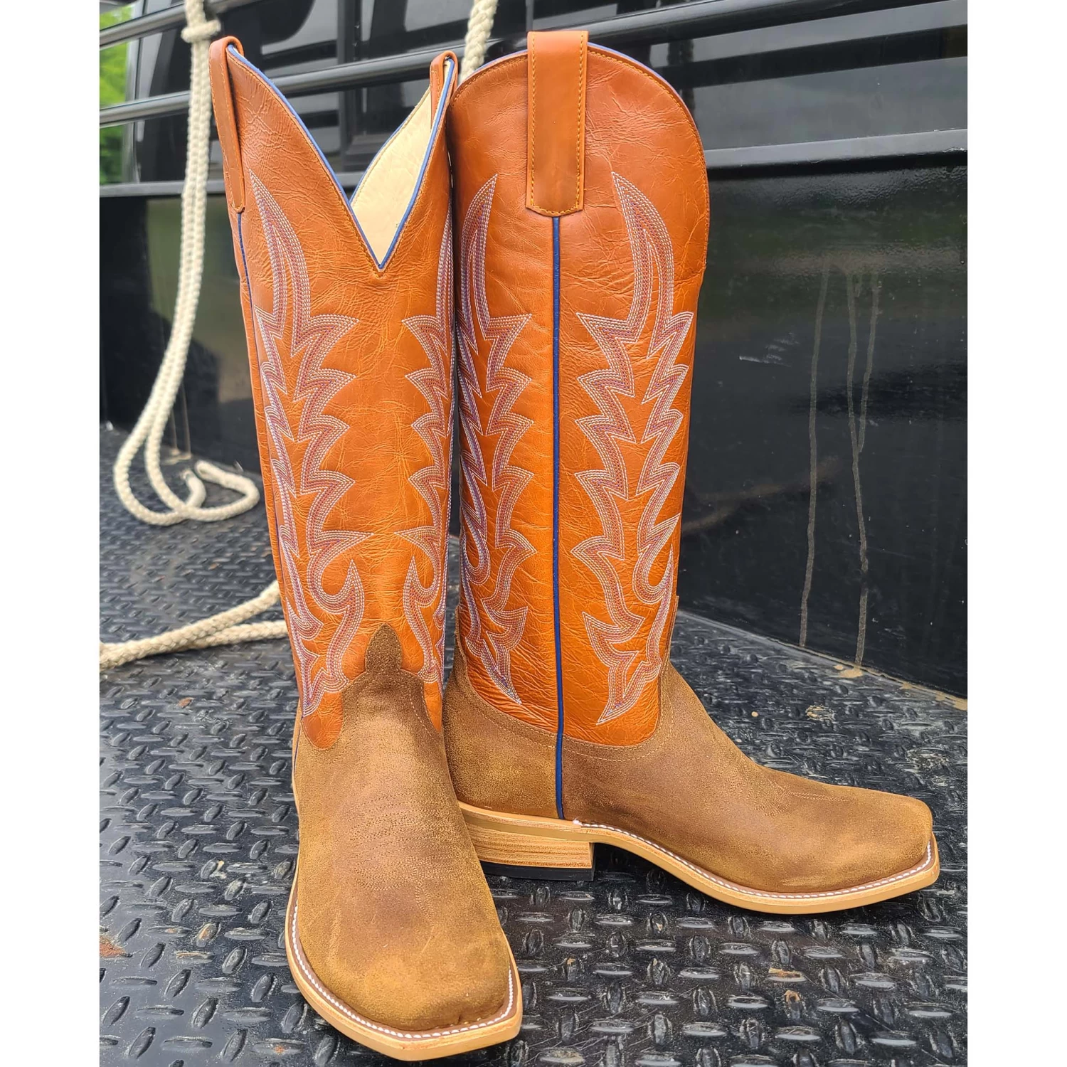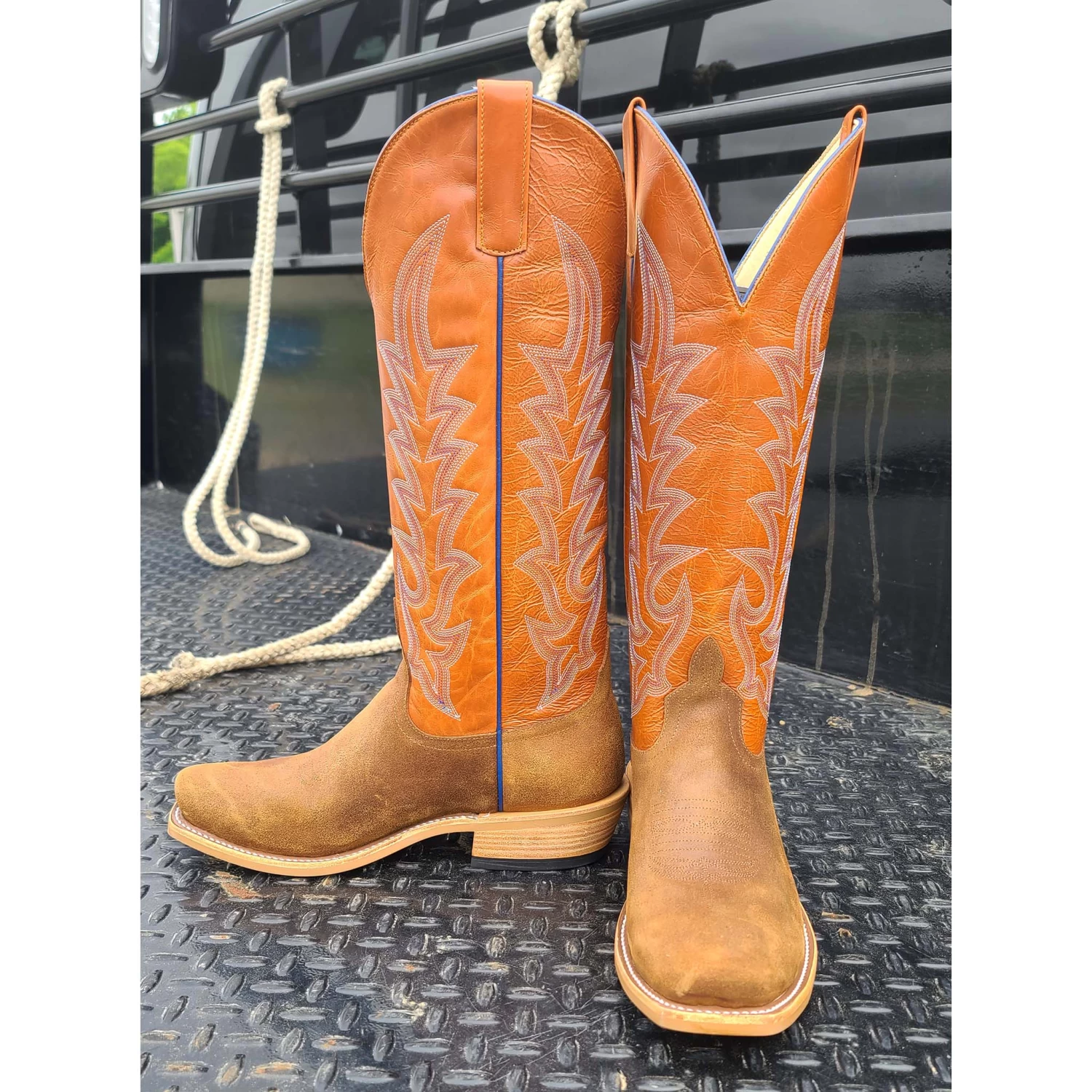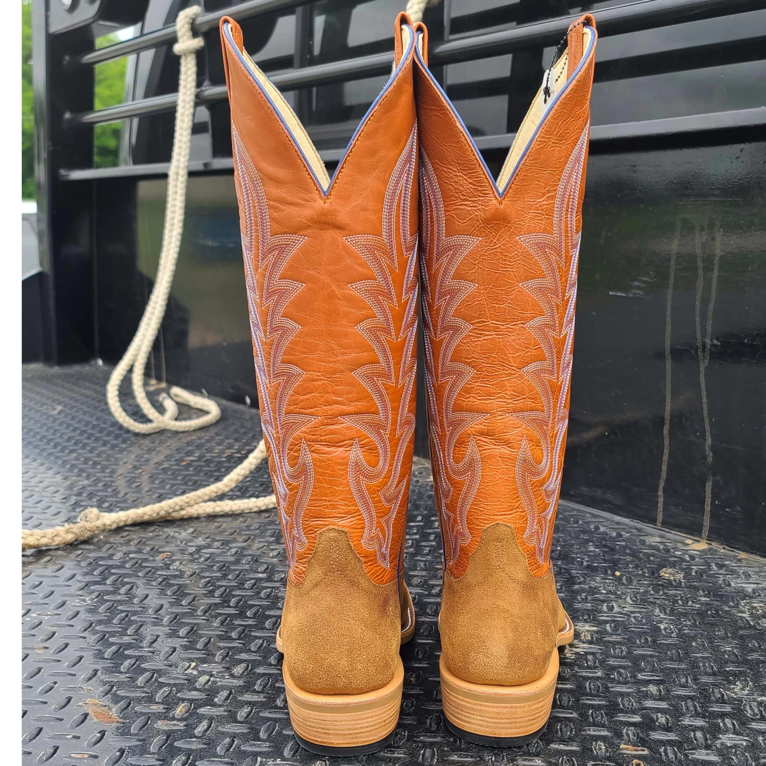This gorgeous dark waxy Kudu roughout boot from Horse Power is made with the real cowboy in mind. Made to last and keep your feet comfortable all day long on the ranch. They feature a 16″ Bucky Tangerine Shaft with a Cowboy Heel and an Oxbow Sole!