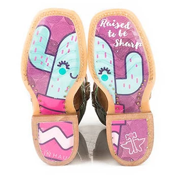 Your little cowgirls will look so cute running around wearing these boots. They feature a brown leather foot with an embroidered shaft with a cactus and flower design.