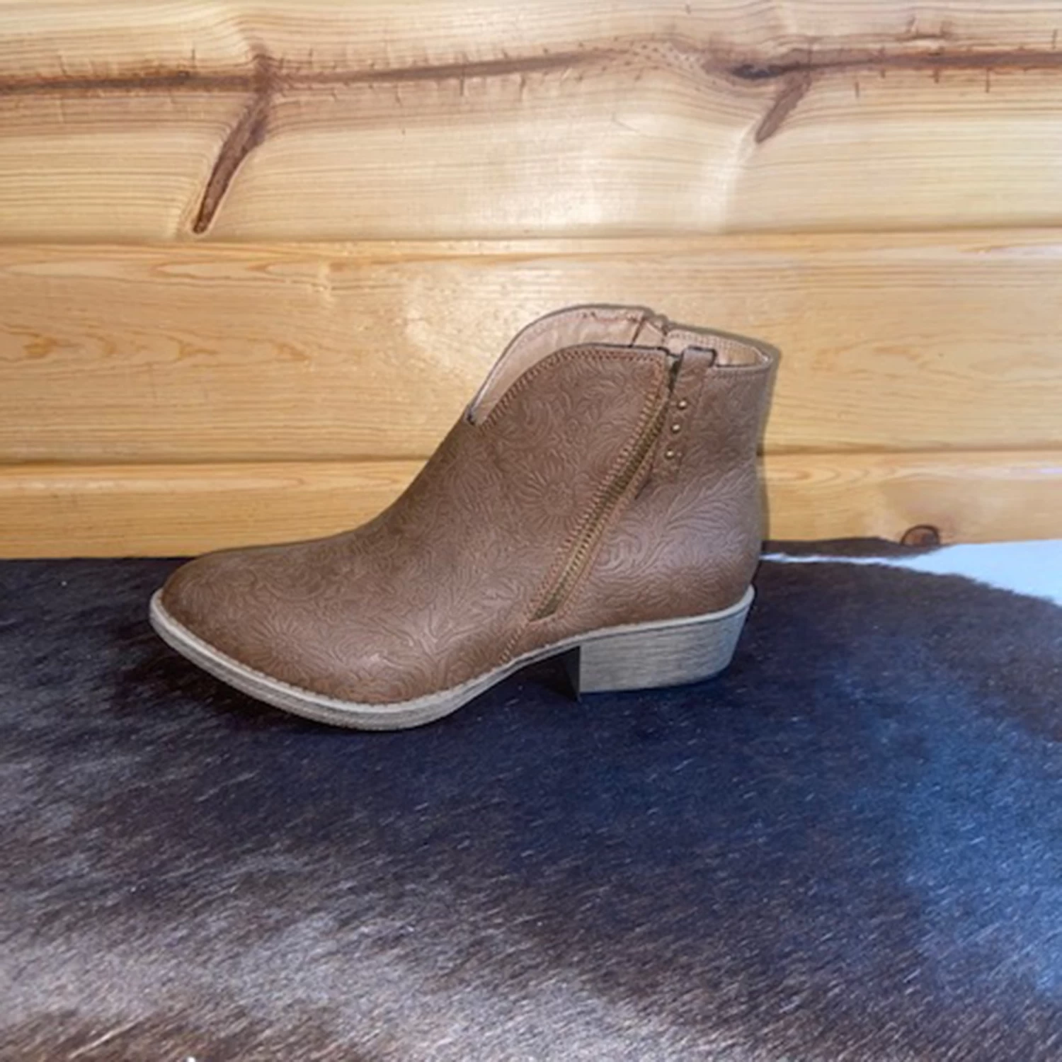 These cute booties are a perfect color to pair with so much. Wear them with your favorite jeans, skirt or dress. The tooled leather will have them catching eyes all around you.
