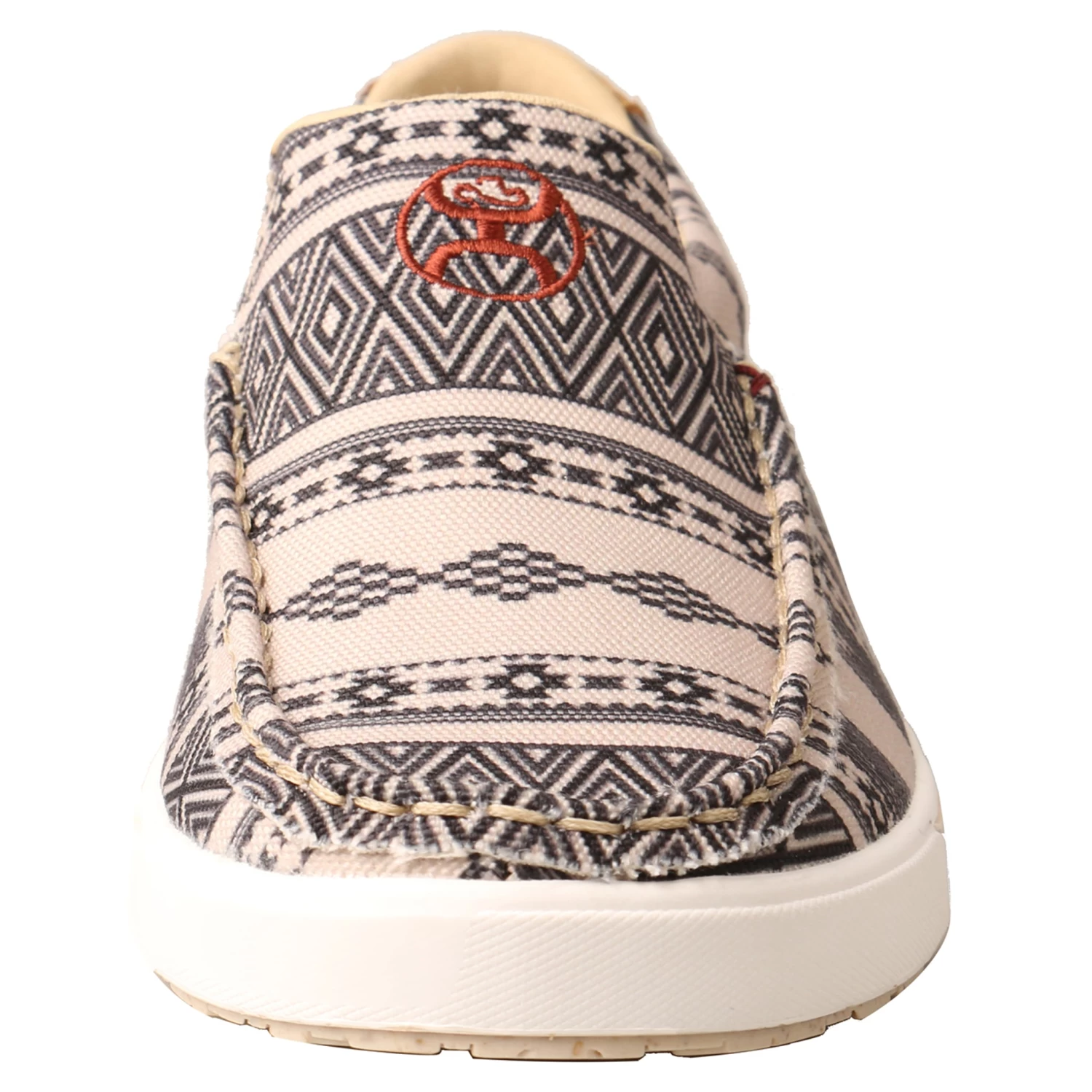 Twisted X Women’s Hooey Brands shoes use unique materials with fun patterns filled with splashes of color. Handcrafted with double stitched seams, these shoes mix style, quality and comfort! You will feel great in these shoes all day long! Check out these beautiful Taupe and Black Aztec Slip-On Hooey Twisted X Shoe. The colors and Aztec pattern is great for all occasions.Â